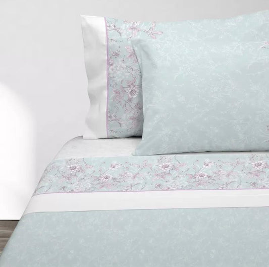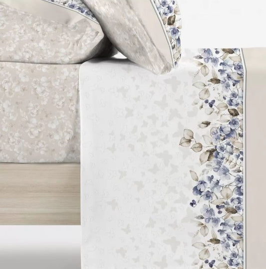 Parure De Draps En Coton Imprimés GARDEN Bleu et Beige