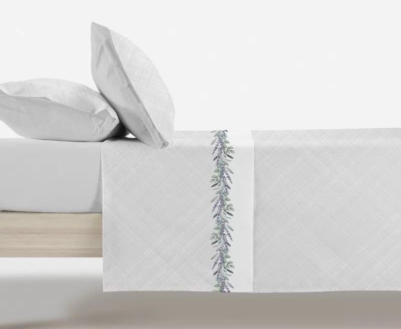 Parure de draps: Parure de draps, 100% coton (30/30) 150 fils, avec un imprimé en forme de feuilles d'olivier aux extrémités du drap plat et des taies d'oreiller à fond gris.