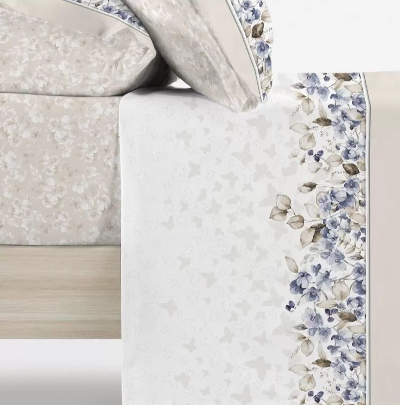 Parure de draps: Parure de draps, 100% coton (30/30) 150 fils, avec un imprimé en forme de feuillage et de papillons aux extrémités du drap plat et des taies d'oreiller à fond beige.